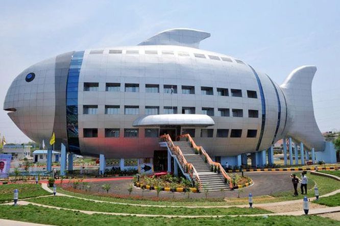Uno de los ejemplos sobre este tipo de arquitectura es la oficina central del Departamento de Pesca de India, construido en 2012. El edificio parece un enorme pez gigante que nada por los aires y sus ventanas rectangulares parecen escamas en su cuerpo plateado. Además, tiene una boca hueca al frente y vidrios azules por ojos.